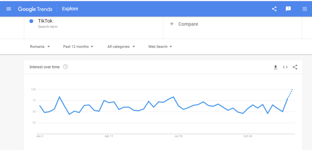 De asemenea, s-a observat un trend ascendent al căutărilor cuvântului “TikTok”, în 2021, lucru ce denotă interesul publicului pentru această platformă. Astfel că, TikTok devine în anul 2022 o platformă ce nu trebuie să lipsească din strategiile de marketing.
