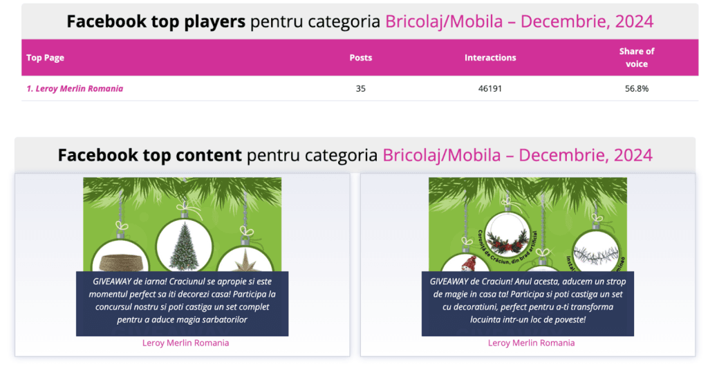 La aproximativ nouă luni de la preluarea conturilor de social media pentru Leroy Merlin România, în prima săptămână a lunii decembrie, am atins o performanță impresionantă: brandul a urcat pe locul 1 în Global Internal Dashboard la nivel de Grup, cu mențiunea “România Leroy Merlin is the best brand of the week!”. Aceasta s-a datorat unor indicatori excelenți de performanță, precum numărul de like-uri, comentarii, rata de engagement și totalul interacțiunilor.