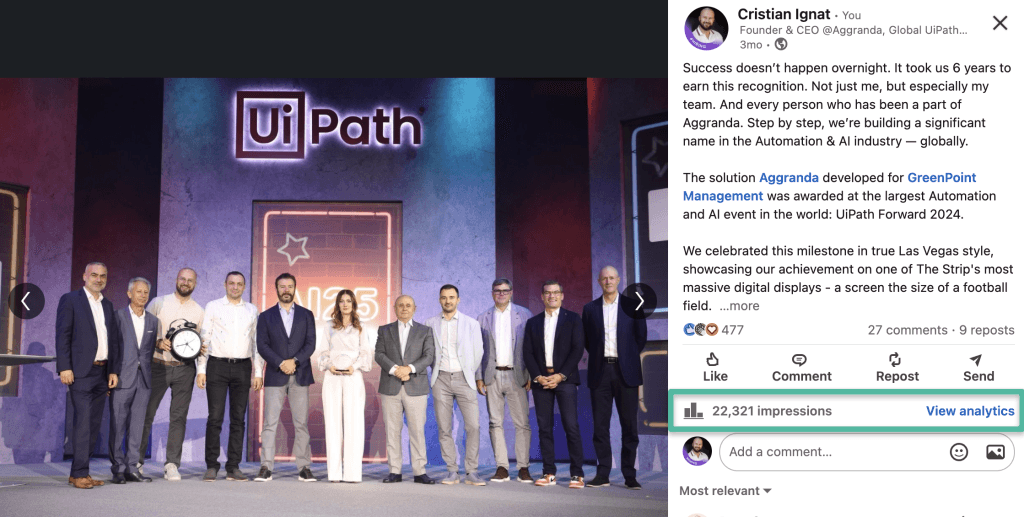 Folosește View Analytics din LinkedIn pentru a analiza datele și a înțelege exact ce tip de public ai atins. Pe baza acestor informații, poți iniția conversații directe cu persoanele relevante, abordându-le prin mesaje private pe LinkedIn.