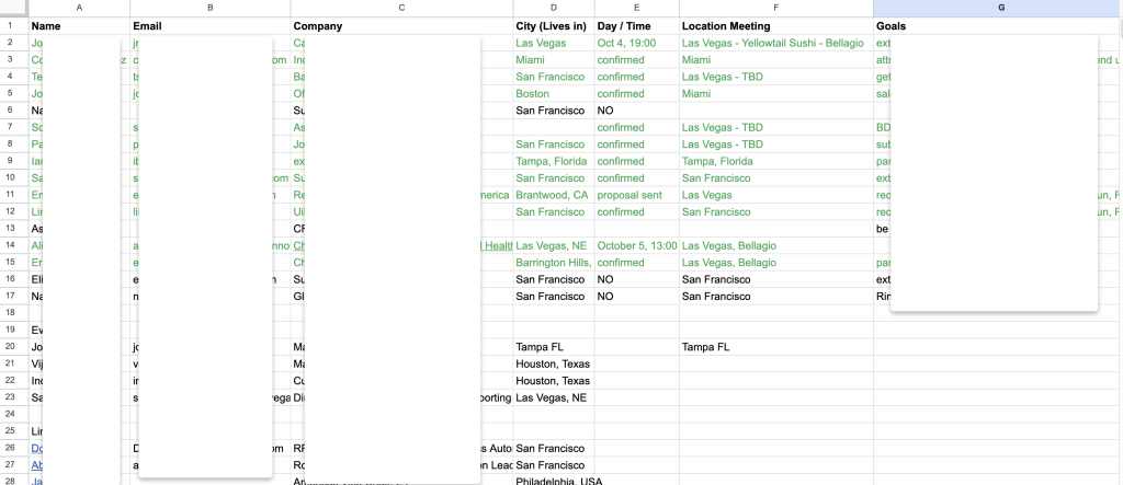 Mai jos este un exemplu de cum îmi organizez abordarea. Îmi fac o listă cu contactele cărora urmează să le scriu pe LinkedIn, având cele mai mari șanse să mă întâlnesc cu ele la eveniment. Uneori este esențial să urmărești conversația și să insiști de 2-3 ori prin mesaje pentru a obține un răspuns – și, mai ales, pentru a securiza o întâlnire, însă tot efortul merită.