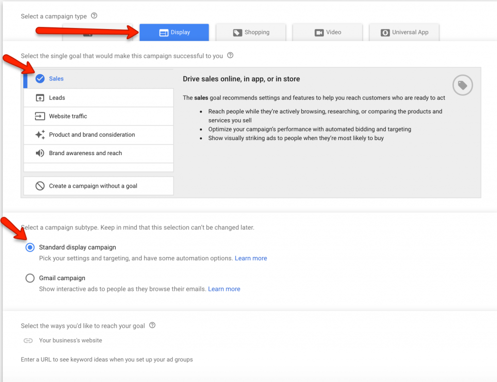 Se creează o campanie nouă cu opțiunea Display Network, obiectivul Sales și subtipul Standard display campaign.