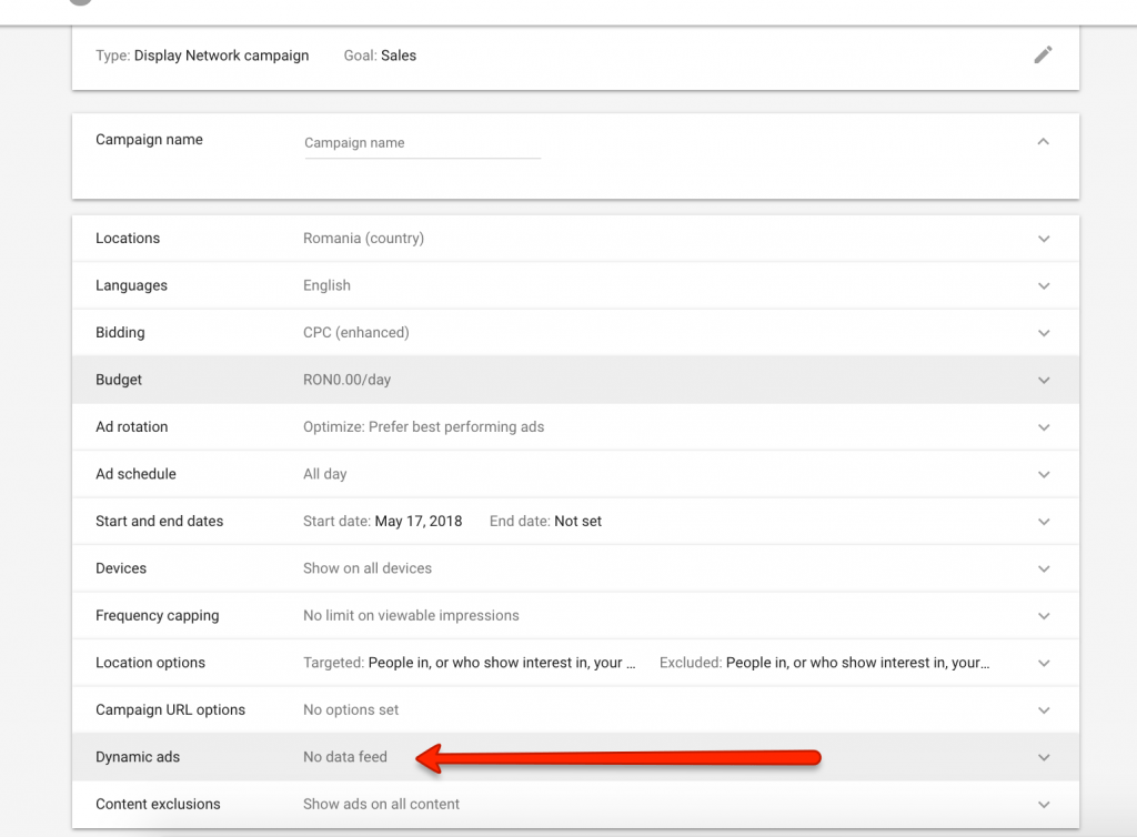 Adaugă numele campaniei, setează o strategie de licitare și bugetul, iar la secțiunea Dynamic Ads se va selecta feed-ul încărcat anterior.