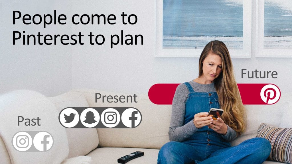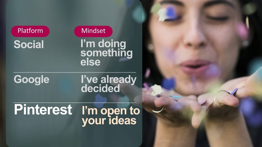 Spre deosebire de alte platforme, pe care utilizatorii le accesează pentru a se conecta cu prietenii sau a căuta în mod specific un anumit brand, pe platforma Pinterest, utilizatorii intră pentru a se lăsa inspirați. Pentru utilizatorii Pinterest, devine din ce în ce mai important modul în care reușește platforma să le capteze atenția din punct de vedere vizual, în detrimentul dimensiunii brandului și mărcii. Având un mindset pozitiv și orientat spre viitor, utilizatorul este mult mai deschis la sugestii și propuneri.