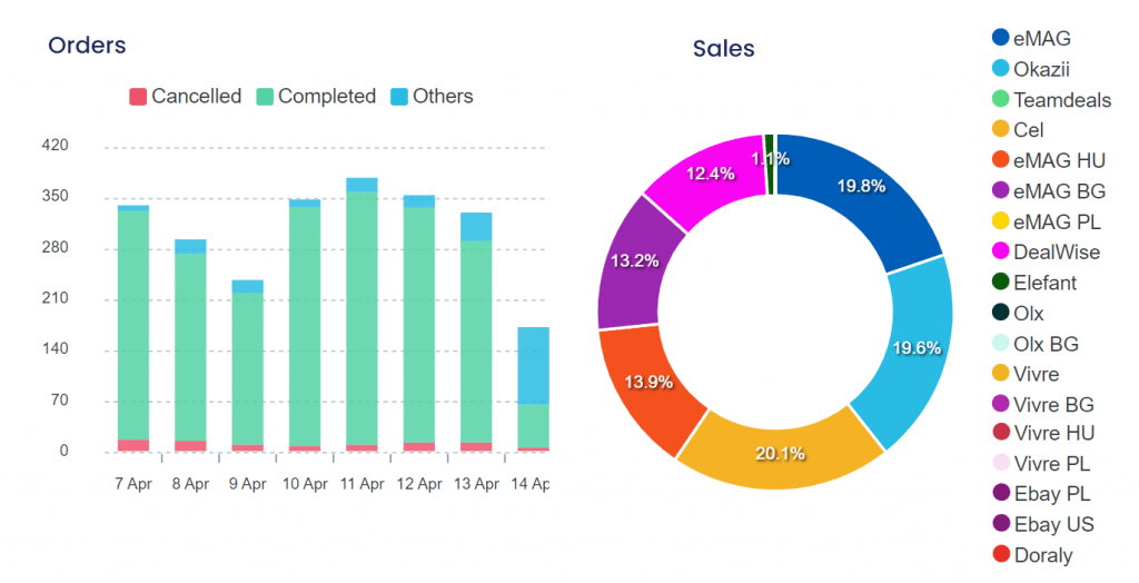 Ponderea vânzărilor din marketplace-urile românești (eMag, Vivre, Elefant, Cel, Okazii) a crescut semnificativ în perioada campaniilor, comparativ cu nivelul comenzilor din site-urile proprii. Dacă în lunile fără campanii speciale ponderea medie a comenzilor procesate din marketplace-uri este de 60%, în perioada campaniilor aceasta crește până la 70%.