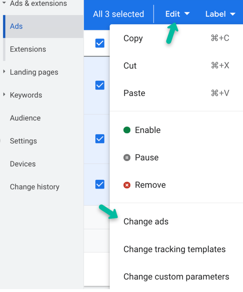 În primul rând, selectăm anunțurile pe care dorim să le modificăm, click pe Edit iar apoi pe Change Ads.