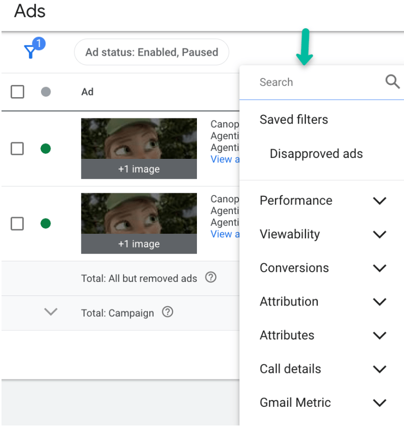 Google Ads ne permite să filtrăm și sortăm rezultatele după o serie variată de indicatori și metrici. Deasupra anunțurilor vom vedea un buton de Add filter care, la click, deschide un meniu din care ne putem selecta metricii doriți, inclusiv aspecte ce țin de Labels (așa cum am văzut mai sus).
