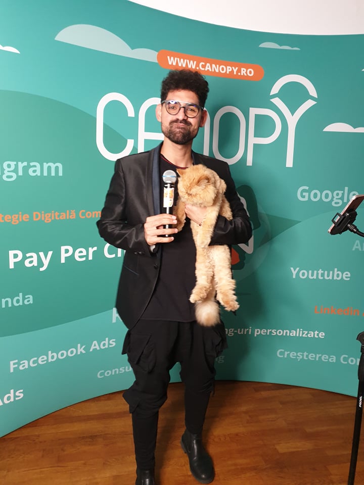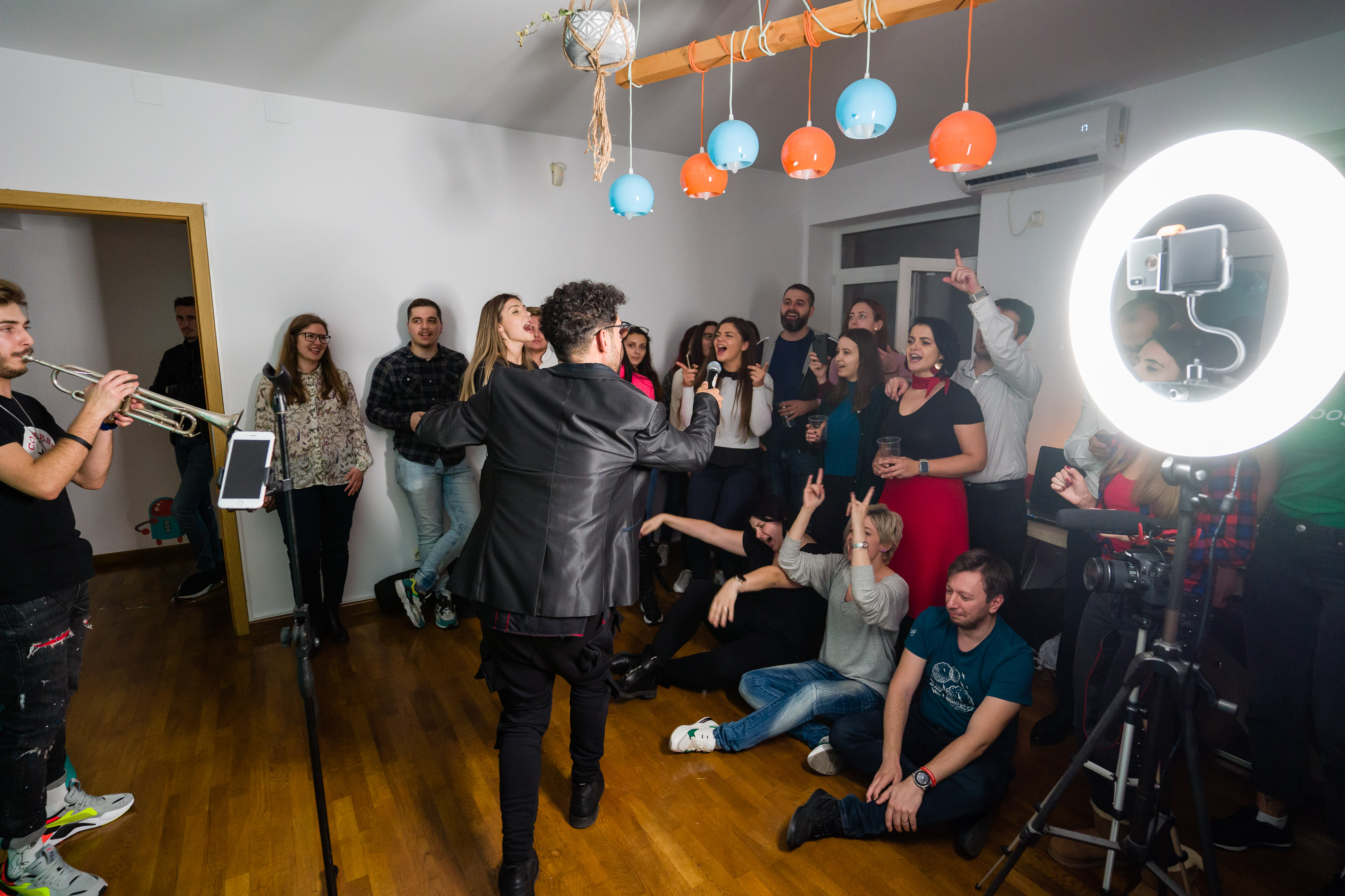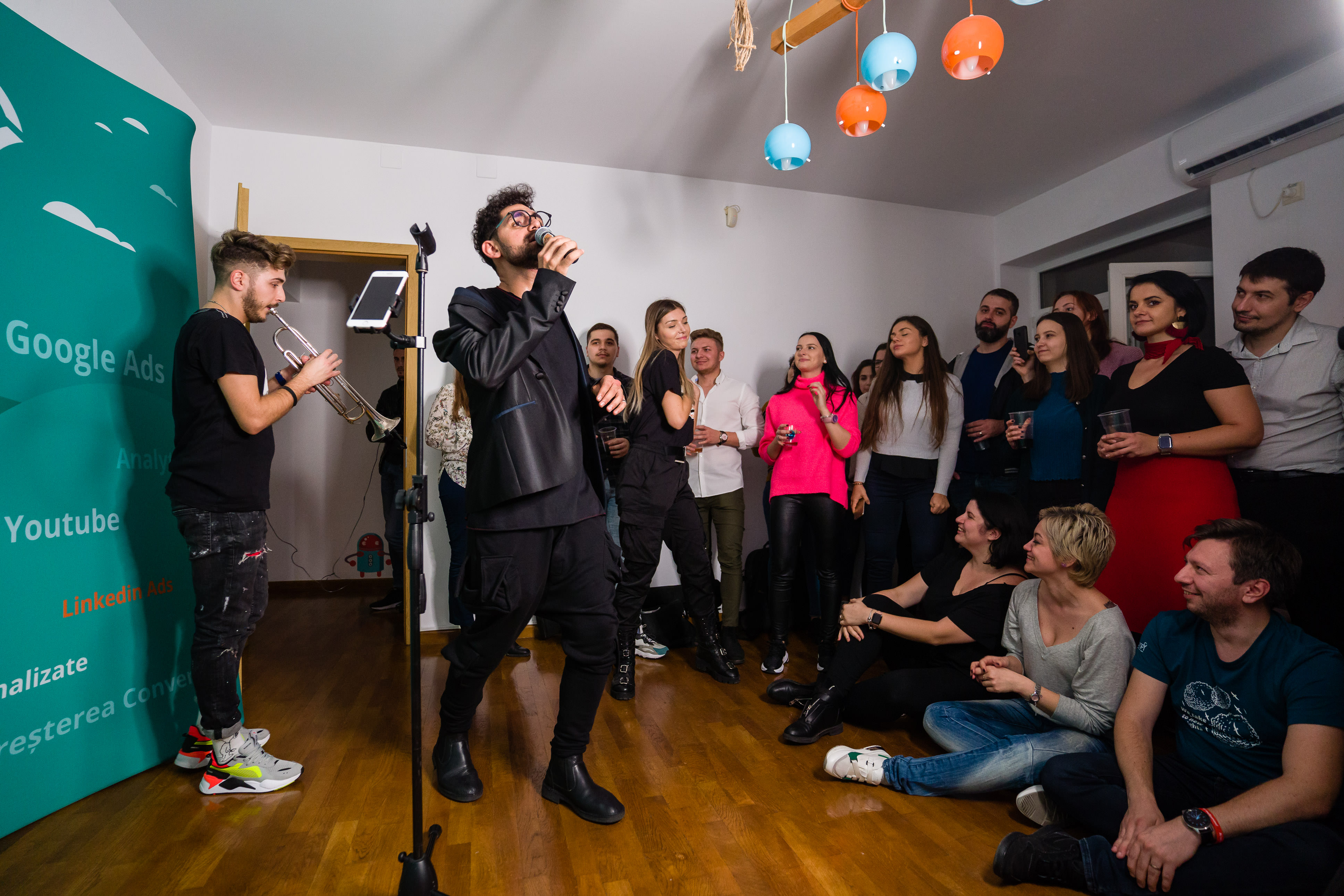Dacă am văzut cum stau lucrurile la nivel național, seara de Black Friday la Canopy nu a fost doar despre cifre, cel puțin până în ora 00:00. A fost despre echipă, clienți și viitori oameni de marketing, toate asezonate cu delicii, muzică și informații noi. Seara de 14 spre 15 noiembrie a început pentru Canopyști cu pizza și un moment de relaxare bine meritat după o zi încărcată, apoi a continuat cu șlefuirea ultimelor detalii pentru campaniile care aveau să înceapă cu succes, am sperat noi, la ora 00:00. Pe măsură ce tot mai multe lucruri erau puse la punct și atmosfera începea să se destindă, urmând ca surprizele serii să apară rând pe rând. Prima surpriză și poate una dintre cele mai originale acțiuni care s-ar putea întâmpla într-o agenție a fost un concert privat cu tot meniul: echipamente, boxe, microfon, instrumentist și piesa de rezistență: Marian Vasilescu, un artist complet care nu doar că știe să cânte foarte bine, ci și să facă show într-o sufragerie de apartament ce ține loc de cameră de ședințe, plină cu Canopyști, pisici și invitații lor.