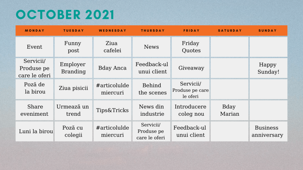 Un alt instrument ce îți poate salva inspirația, este calendarul de topics. Cu ajutorul acestuia, îți poți trasa în linii mari subiectele pe care vrei să le abordezi în săptămânile ce urmează, în funcție de sărbătorile internaționale (relevante pentru business-ul tău), de evenimentele viitoare sau de zilele de naștere ale colegilor. După ce ai creat acest calendar de topics, tot ce îți rămâne de făcut este să creezi postările efective și să fii atent la real time marketing, dar și la evenimentele/întâmplările sau sentimentele pe care le ai pe moment și simți nevoia să le exprimi, dacă este relevant și benefic pentru business-ul tău.