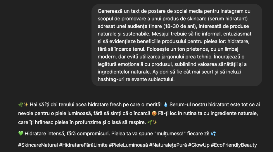 În exemplul următor, vei observa cât de ușor poți crea un text pentru o postare de promovare a unui produs, care poate fi ulterior adaptat cu ușurință în funcție de direcția în care dorești.