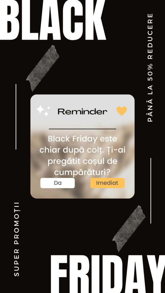 Cu toții știm că oamenii se pregătesc din timp pentru acest eveniment și caută activ oferte și promoții disponibile. O modalitate prin care poți ajunge în atenția lor este să folosești hashtag-uri, precum #BlackFriday sau #oferteBlackFriday.