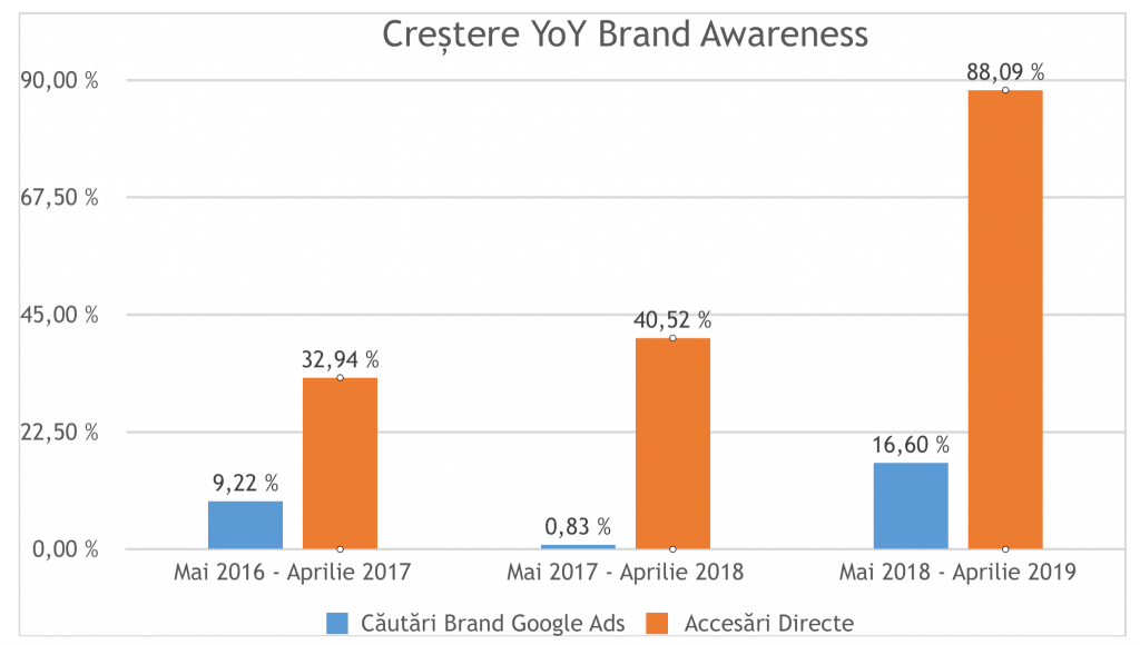 Deși în perioada mai 2016- aprilie 2017 observăm că avem o creștere mai mare pe accesarile directe, brandul devine foarte puternic în perioada următoare, numărul căutarilor pe brand crescând cu 60.76% în aprilie 2019, comparativ cu mai 2016.