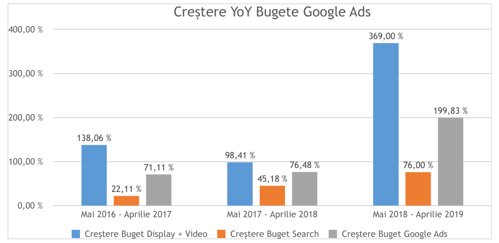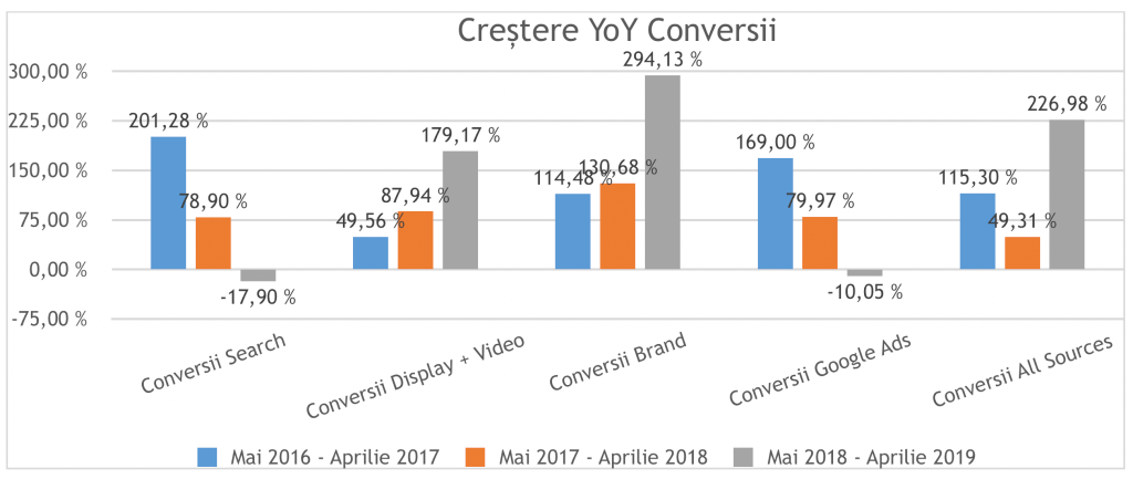 Cu o creștere de buget de 106% comparativ cu anul de debut, am obținut o creștere de conversii cu 400% față de perioada mai 2016- aprilie 2017. Mai mult, creșterea bugetului pe Display și Video a influențat pozitiv atât creșterea numărului de conversii, cât și crearea unui fundament solid pentru celelalte tipuri de campanii.