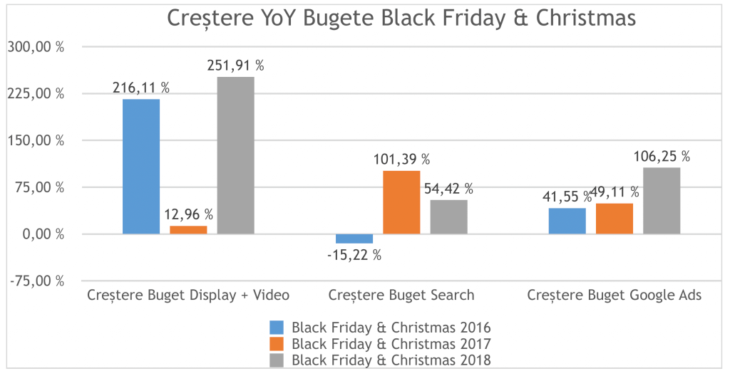 Perioadele de Crăciun și Black Friday, cu un comportament atipic, sunt cu atât mai importante să fie susținute de un mix de video și display, orientate și către conversii, întrucât rolul acestora se schimbă din awareness în conversii, perioada de achiziție fiind mai scurtă acum și impactul acestor campanii poate fi măsurat direct și într-un timp mai scurt.