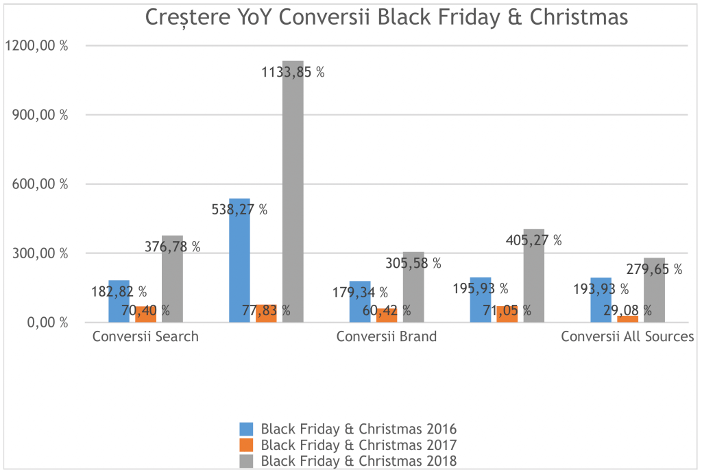 Am analizat și o perioadă mai scurtă, Black Friday & Christmas 2016 vs Black Friday & Christmas 2017 vs Black Friday & Christmas 2018, cu aceeași diferență de strategie și produse Google utilizate.