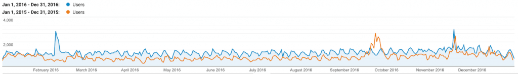 Rezultatele înregistrate în Google Analytics ne arată creșteri semnificative al nivelului de trafic, comparând anul 2016, în care am început activitatea, cu 2015: